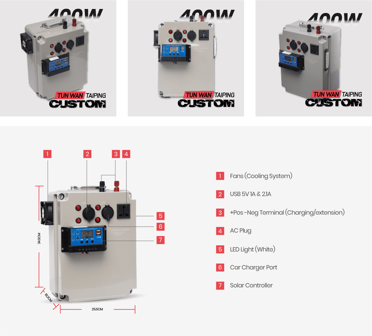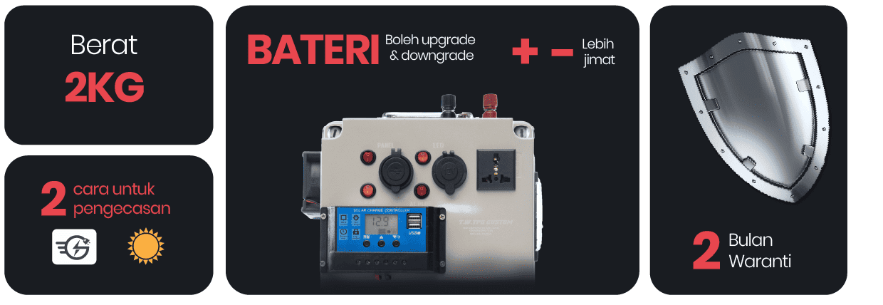 Kami tawarkan Inverter sahaja untuk memberi peluang kepada anda memilih bateri mengikut budget anda. Untuk produk ini, anda boleh tambah max sehingga 3 Bateri (Lead-Acid). Ini juga akan memudahkan anda menukar ganti bateri dan memilih bateri mengikut budget anda. Untuk produk yang lain (termasuk bateri) mungkin lebih mahal dan baterinya tidak boleh ditukar ataupun upgrade/downgrade.